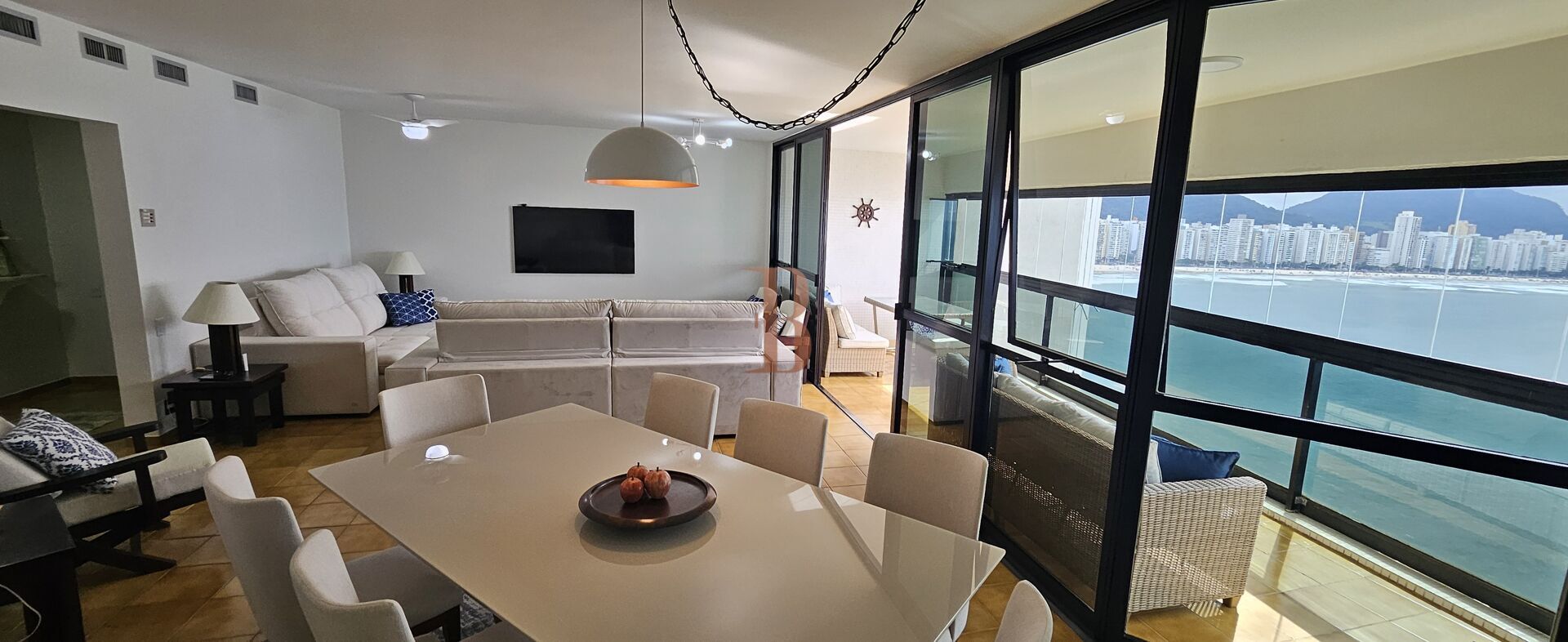 Este lindíssimo apartamento com vista deslumbrante para as praias Pitangueiras e Enseada está localizado na praia das Astúrias, em uma rua a qual foi considerada umas das mais charmosas da Costa a Rua Costa Esmeralda. Com duas unidades por andar, possui quatro dormitórios, todas suítes, sendo uma de colaborador. O living possui ar condicionado central e é composto por salas de estar e jantar com vista deslumbrante para o mar. São duas vagas na garagem e portaria 24 horas.